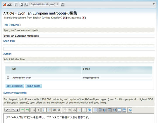 All content in eZ Publish can be translated to multiple languages. Having only one website to administer is efficient and makes it easier to maintain a consistent brand across languages and countries.