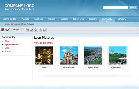 eZ Publish makes it easy to create picture galleries. With the multi-upload functionality, you can add many pictures at once, then eZ Publish will scale, format and resize the pictures automatically.
